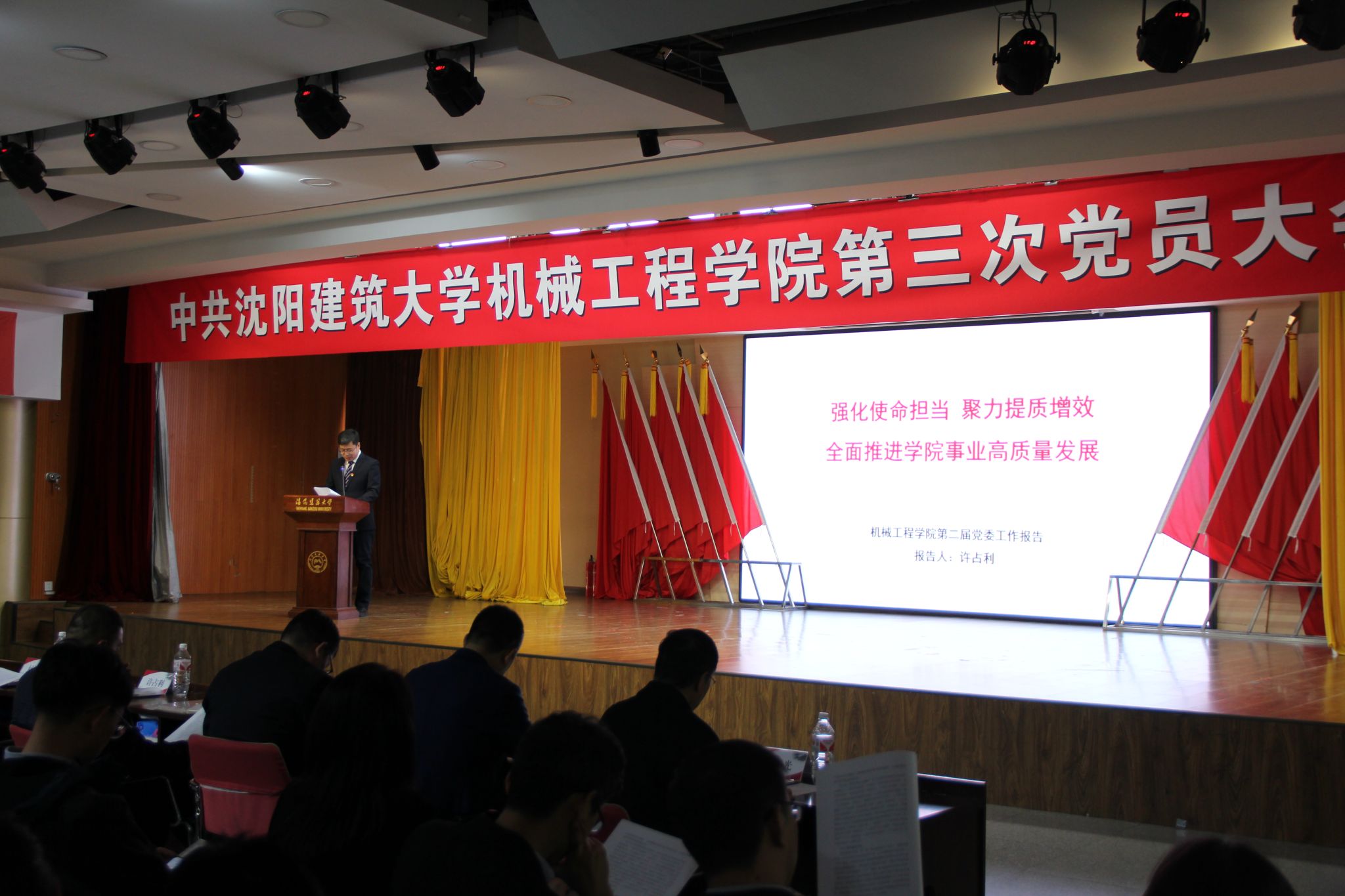 许占利代表第二届党委全面总结了过去五年学院在党的建设、学科建设、教育教学、人才培养、科研与社会服务工作、国际交流与合作、师资队伍建设以及工会工作等8个方面所取得的成绩;深刻剖析了当前工作中存在的问题,分析了面临的挑战与机遇;提出了未来五年和到2050年学院发展目标和工作任务。