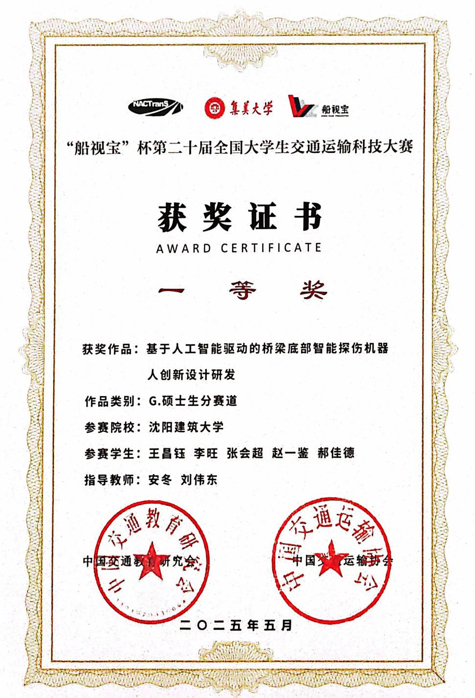第二十届全国大学生交通运输科技大赛决赛于5月23—25日在集美大学成功落幕。由beat365官方网站安冬教授担任指导老师,研究生王昌钰、李旺、张会超、赵一鉴、郝佳德组成的参赛团队表现优异,成功斩获全国一等奖。