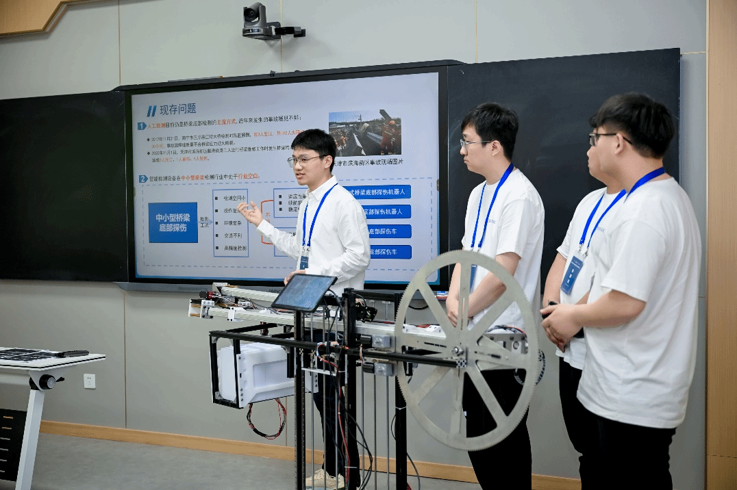 团队作品针对桥梁检测领域传统人工巡检与常规检测技术手段存在作业效率低、安全风险高等问题,设计了一种桥梁底部探伤机器人。所开发的自主性与智能化集一体的机器人应用范围广阔,能够完成一系列复杂的任务,相较于传统人工与其他机器检测维护方式拥有强大的竞争力。