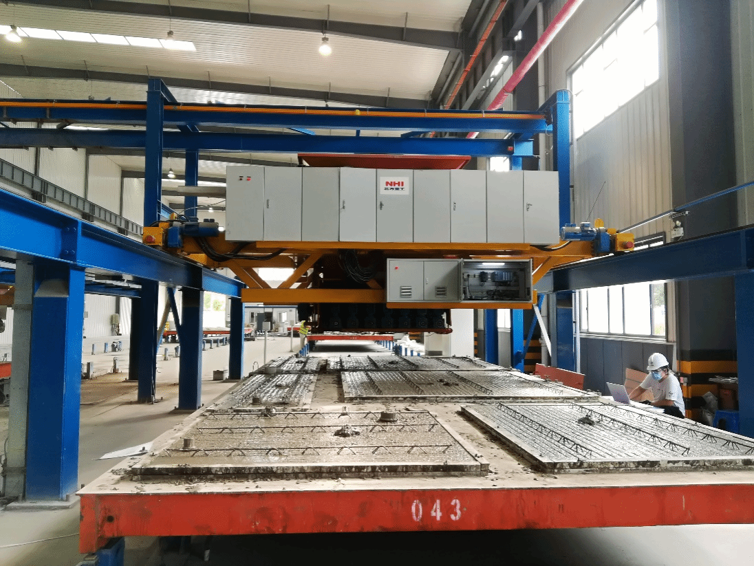 复杂预制构件混凝土数字化智能精确布料系统具备位置、重量、安全限位等感知能力,可从信息解析、布料规划、精确控制等方面,自动实现带非布料区或横纵混排板类复杂预制构件的浇筑生产。布料机器人系统生产前可解析构件图纸信息,通过规划计算模型,自动实现布料生产的规划设定,再通过实时控制模型及流程,实现构件的自动浇筑生产,较好解决了混凝土布料环节生产数据信息获取难、人工劳动强度大、布料效率低和人工成本高等问题。