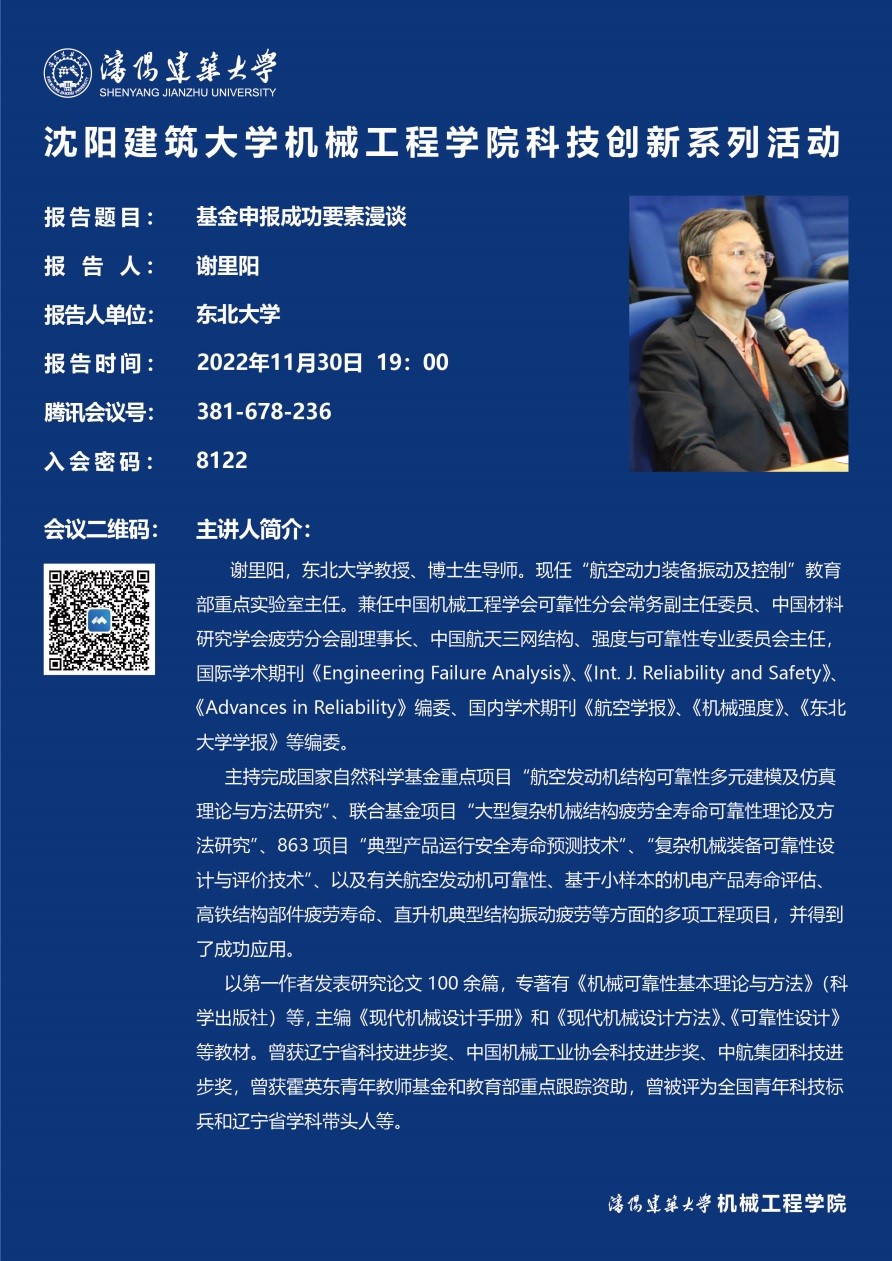 为深入学习贯彻党的二十大精神,全面落实“四个面向”,集聚力量进行原创性引领性科技攻关,增强自主创新能力,多措并举践行科研育人。11月30日,beat365官方网站举办科技创新系列活动,邀请东北大学谢里阳教授开展题为“基金申报成功要素漫谈”的专题报告,学校200余名中青年教师及学生参加了报告会,全国部分高校及科研院所学者聆听了报告。报告会由学院副院长张啸尘主持。