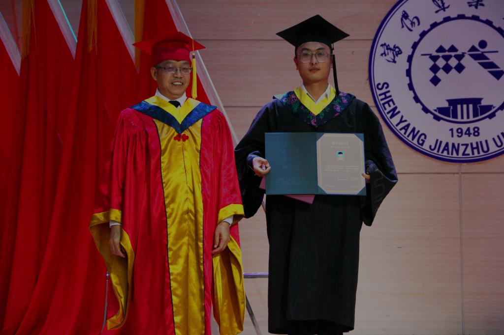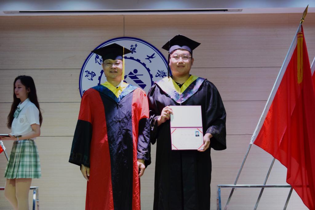 孙红、李颂华为毕业生代表颁发毕业证书、学位证书。孙红为2022届机械工程专业标兵章艺译授专业旗并颁发荣誉证书。象征机械精神的专业旗由学院2019届机械工程专业标兵桂召健(现为2022届硕士毕业生)传递给了章艺译,希望机械精神永远地传递下去。