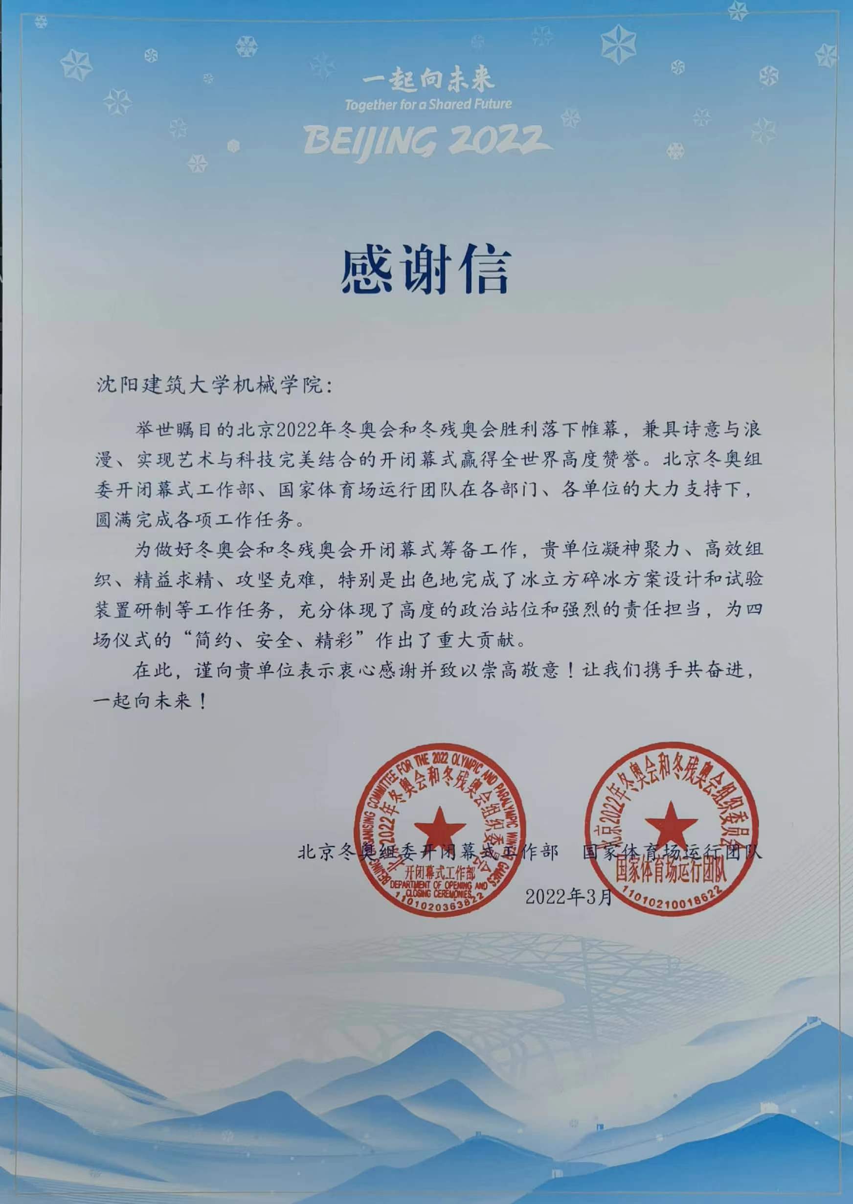 近日,北京2022年冬奥会和冬残奥会组织委员会向我校发来感谢信,对我校机械学院雷东亮教师研究团队承担的冬奥会和冬残奥会中的冰立方(含五环)碎冰方案设计及冰立方(含五环)碎冰试验装置研制等工作给予高度肯定和认可。