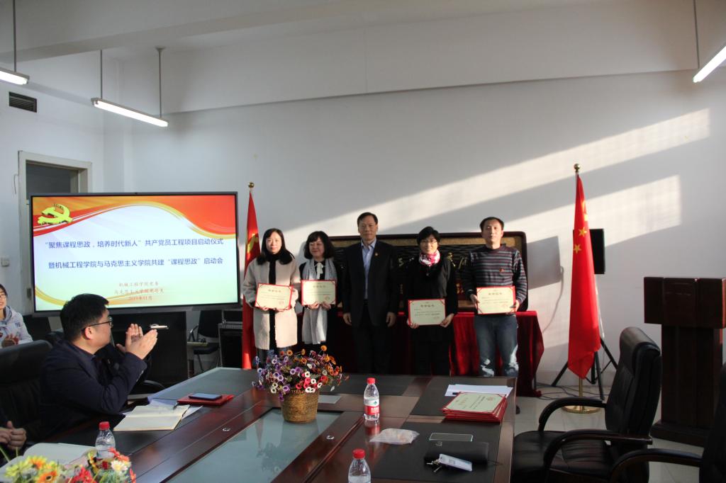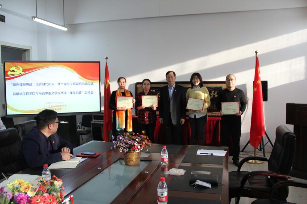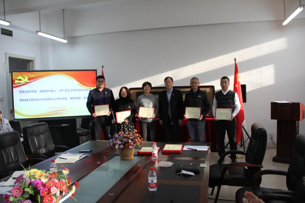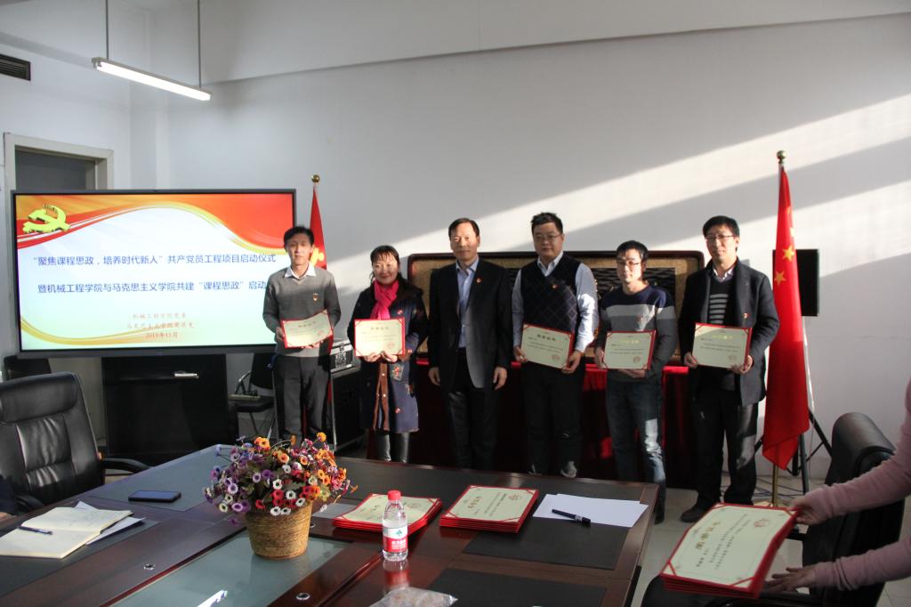 会上,机械学院党委负责人介绍了“聚焦课程思政,培养时代新人”共产党员工程项目,以及通过项目与马克思主义学院开展合作共建的相关情况。为发挥党员的示范引领作用,决定对费烨等10名党员教师主讲的7门课程进行“课程思政”立项建设,并聘请马克思主义学院阚迪等9名教师为“思政理论指导教师”。学校党委书记董玉宽为立项教师和指导教师颁发了证书和聘书。